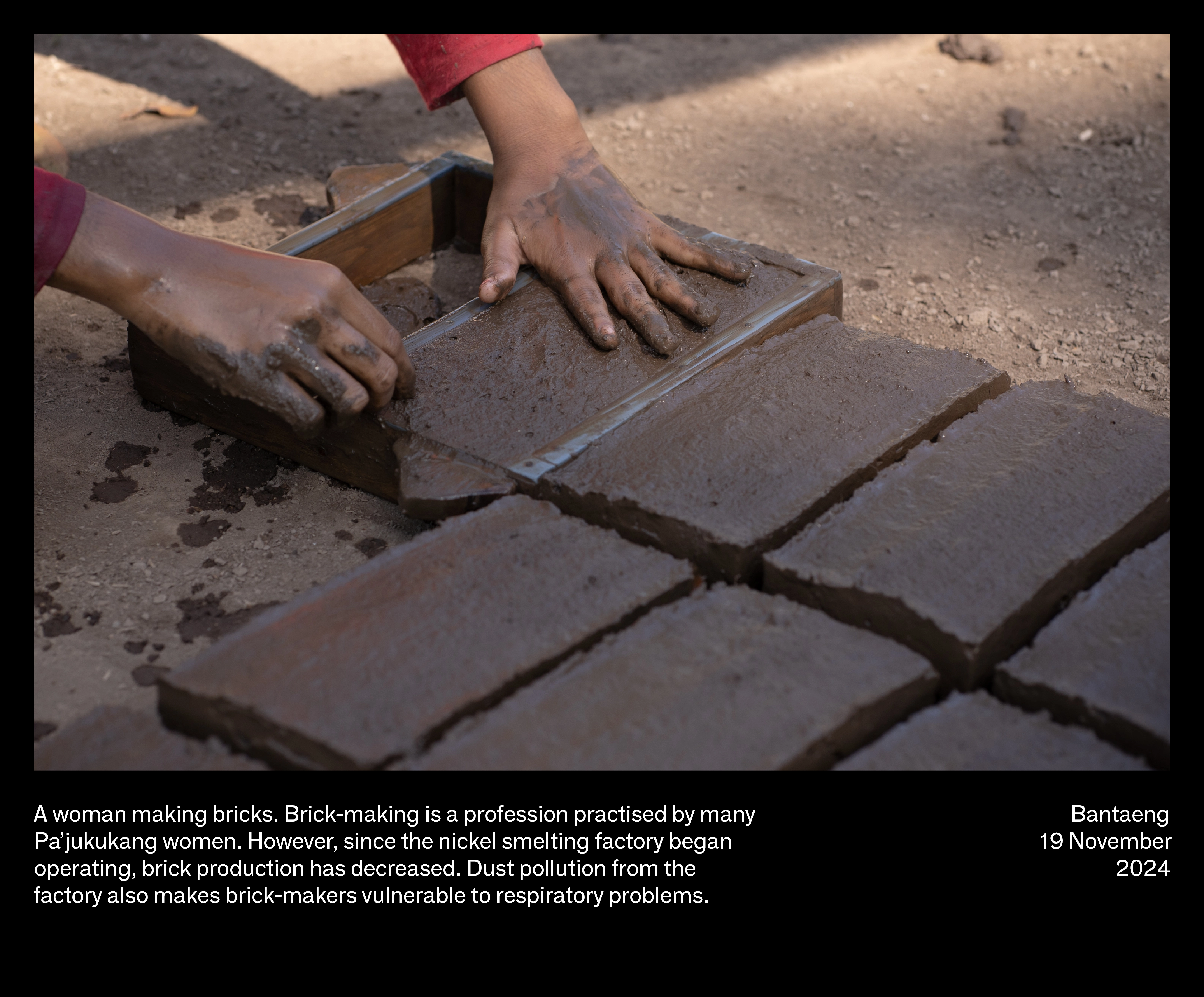 The extractive operations of the nickel industry have impacted not only Jusman, Yeni, and Hasiah, but many others in Pa’jukukang. By 2023, the Indonesian government had issued 373 nickel mining concessions. This industrial expansion has cleared nearly 80,000 hectares of forest, threatening ecosystems and dismantling local livelihoods. Residents are left struggling for clean water, breathable air, and healthy soil. And they are forced to face a painful dilemma: leave everything behind, or stay and bear the consequences.
