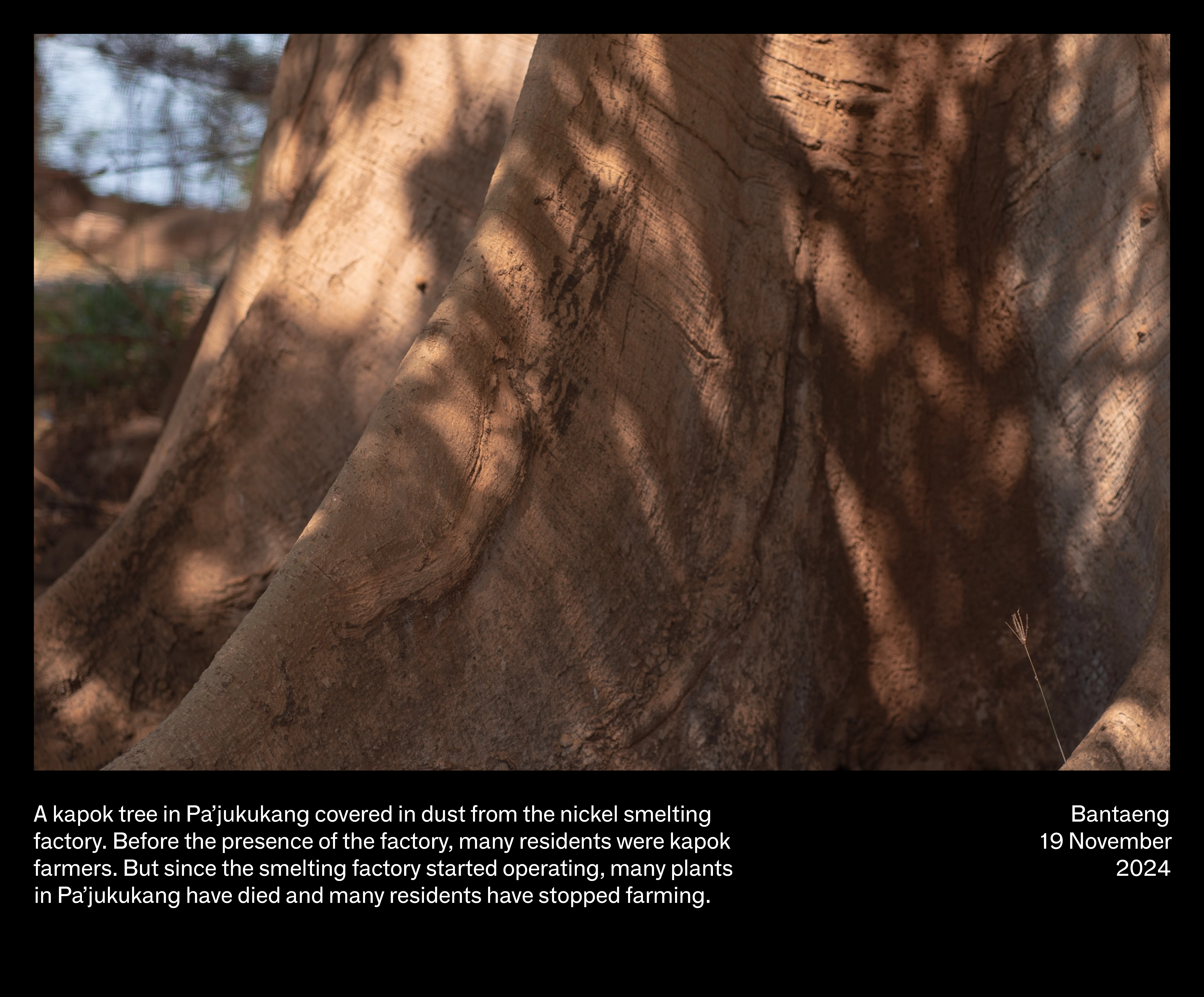 In 2013, Pa’jukukang Subdistrict was included in the Kawasan Industri Bantaeng (KIBA), or Bantaeng Industrial Area: one of the National Strategic Projects (PSN) initiated by Indonesia’s seventh president, Joko Widodo. KIBA was initially introduced as an area to process agricultural and fishery products from Bantaeng residents. But in the same year, a nickel company entered the area and began measuring the land. Together with the government, the company encouraged residents to sell their land for the development of the industrial area. After inheriting her grandfather’s land, Hasiah was able to build a house from the proceeds of selling the land to the Huadi Nickel Alloy factory. And, when the smelting plant began operating in 2019, immense amounts of dust began to disturb the lives of Hasiah and other Pa’jukukang residents.