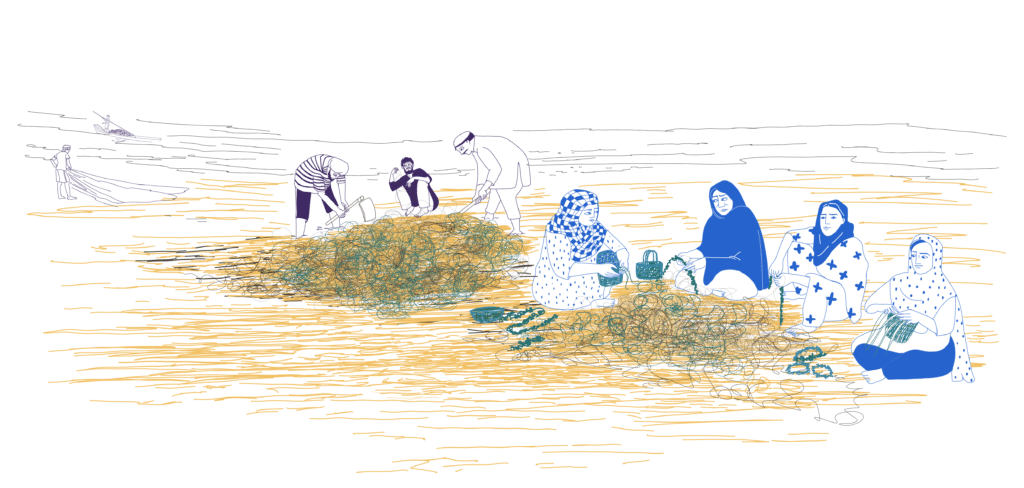 Along the coast, fishing communities have pulled seven tons of ghost nets from the Arabian Sea, nets lost by trawlers, sometimes buried so deep in sand that they take a week to extract. Men do the hauling. Women transform the salvaged nylon into woven products: bracelets, bags, functional goods. Six tons recycled so far, according to Usman Iqbal, who manages the Olive Ridley Project’s coastal work, with orders fulfilled directly to customers – no middlemen extracting margin.