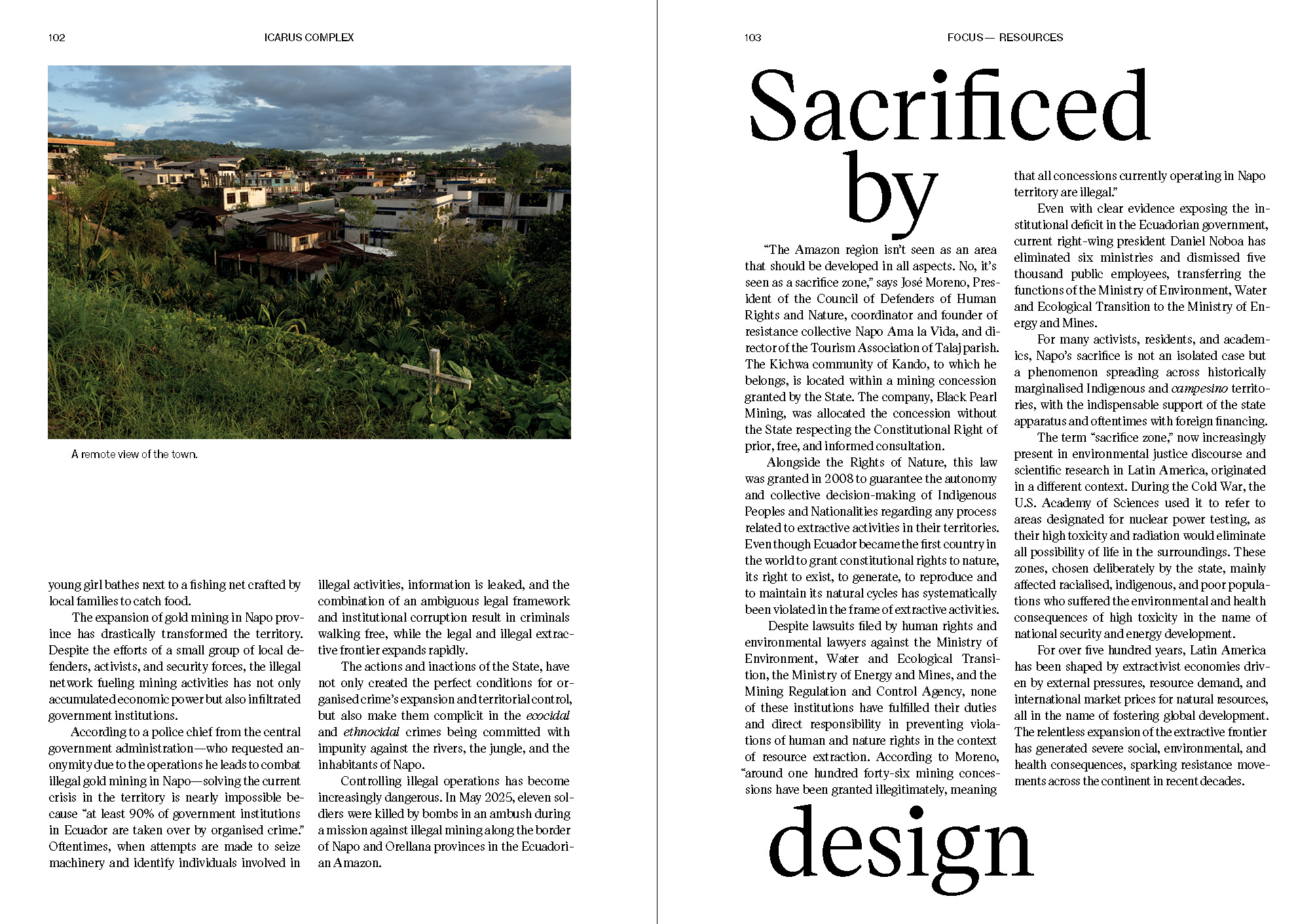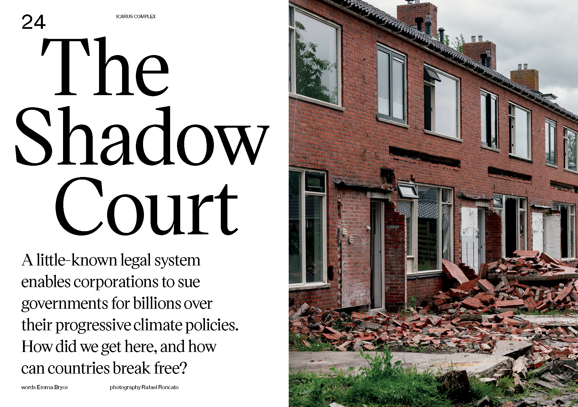 This issue focuses on some of the systemic challenges of continuing our relationship with fossil fuels. In The Shadow Court, journalist Emma Bryce delivers a fascinating investigation into Investor-State Dispute Settlements, where fossil fuel companies game the legal system to their advantage, forcing taxpayers to pay them millions in compensation for decarbonisation efforts. They also use the courts to silence organisations and individuals through SLAPP suits, which we examine more closely in Democracy Dies in Darkness. In The False Economics of Feasibility, Stefano Cisternino explores how billions in taxpayer and government money rig the economic market in favor of fossil fuels, creating a false sense of affordability and dependence. Taking a step back and looking at the systems in place, reveals that our continued propping up of fossil fuel companies not only increases atmospheric carbon but undermines our economies, our democracies, and the very notion of justice. This allows for a deeper conversation that goes beyond temperature fluctuations and graphs. In Reflections we invited artist Francesco Pasquini to share his poetry with us, in Voices we speak to Dr. Nicole Redvers and architect Mariam Issoufou. The Moon Did Not Meet The Crab is a touching photo story by Pulitzer Prize winning photographer Felix Marquez. And finally Gold-mining in Napo is the result of writer and researcher Daniela Beltrán’s important work on gold-mining in the Ecuadorian Amazon, highlighting all the environmental, social and economic tensions it represents.