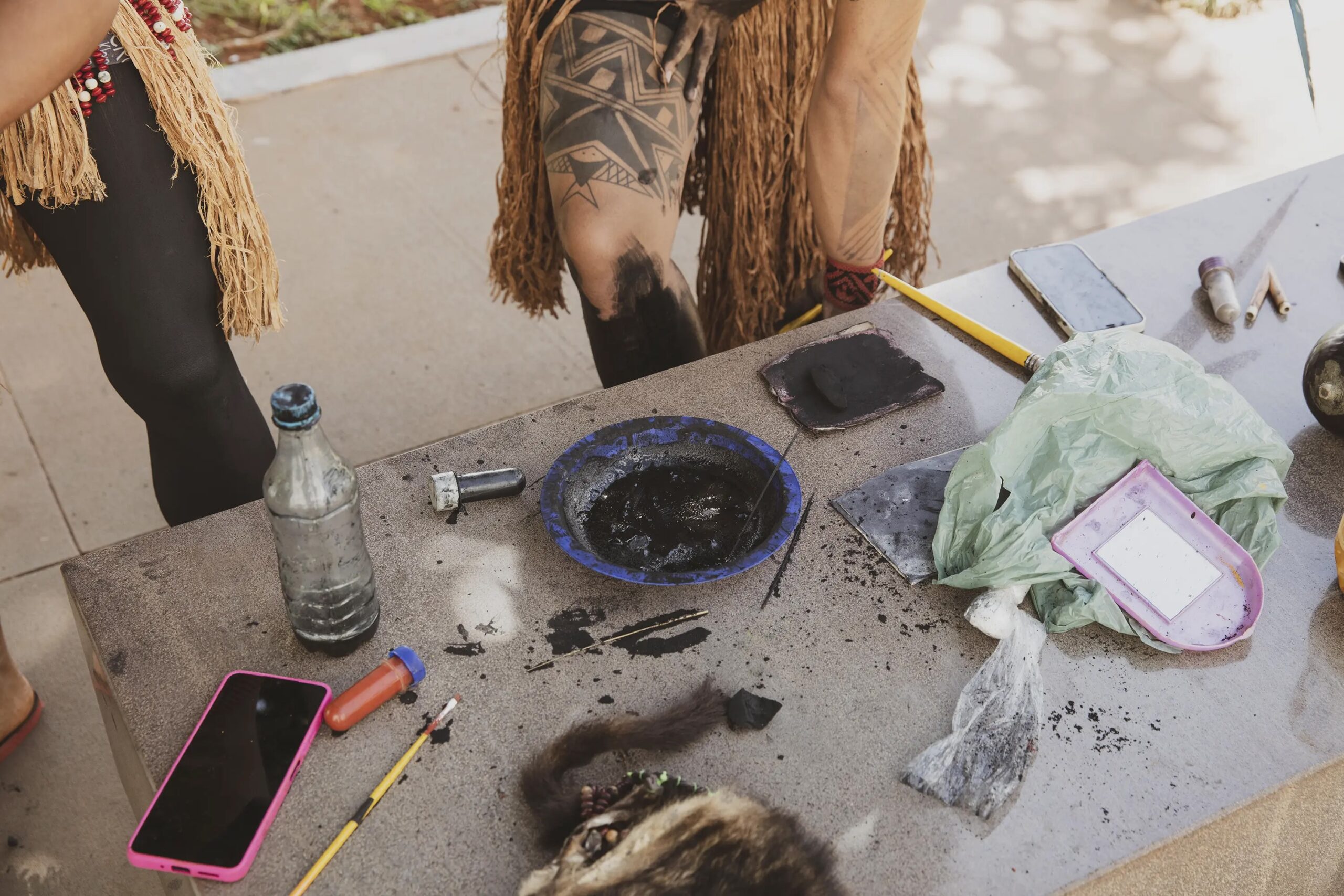 During the days of Camp that followed, we ran into a myriad of body painters from multiple territories. They cover the bodies of the attendees with paintings made of ‘genipapo’ and ‘urucum’, traditional fruits with heavy black and red dyes. The paint is etched onto people’s skins manually using traditional techniques, and the aim of covering the body with paint is to provide protection. Since the communities gathered at Camp are getting ready to march towards the Congress and the Presidential Palace, bringing their demands to the government, the paint applied is an extra layer of spiritual coverage from any threats they may face. The paint, which lasts for a couple of weeks as it fades slowly out of the skin, mimics patterns of animals like the cobra, the jaguar and the turtle, depending on their lands and traditions, and it shields the bearer against attacks, whilst also honouring the history of their territories.