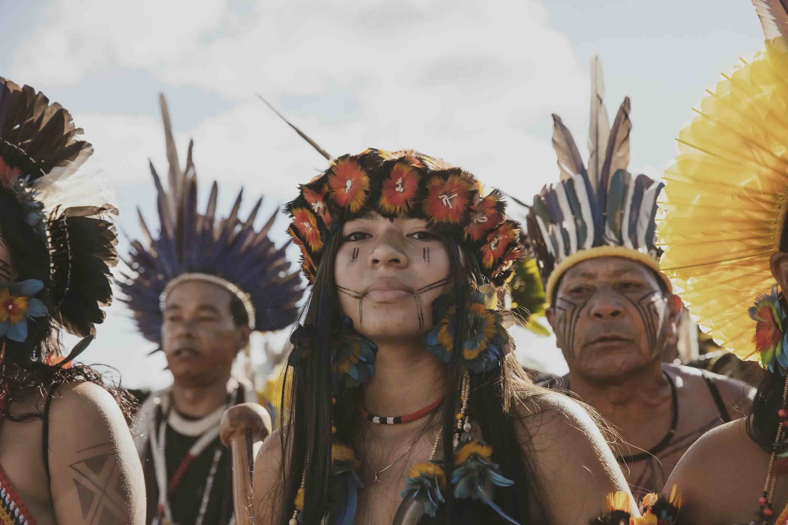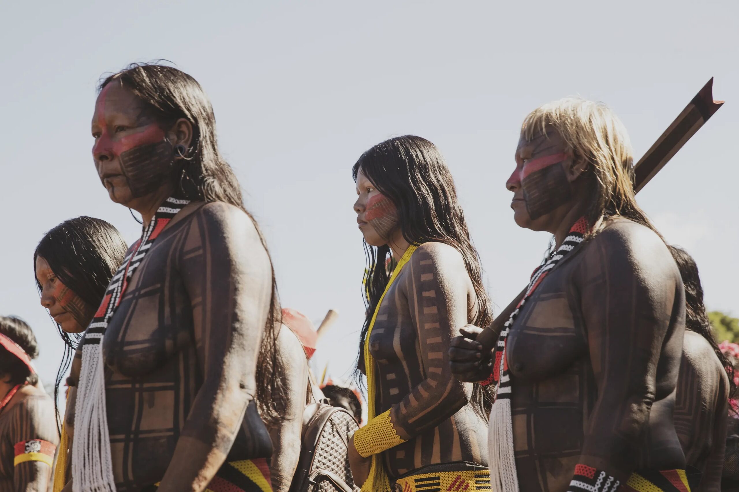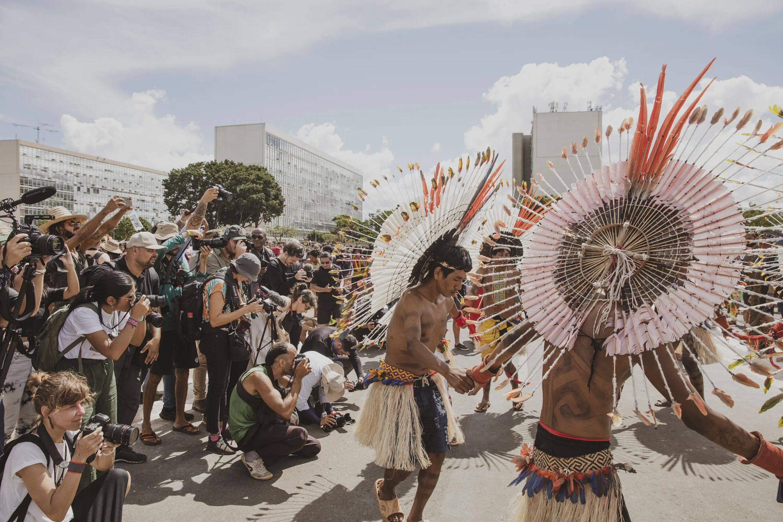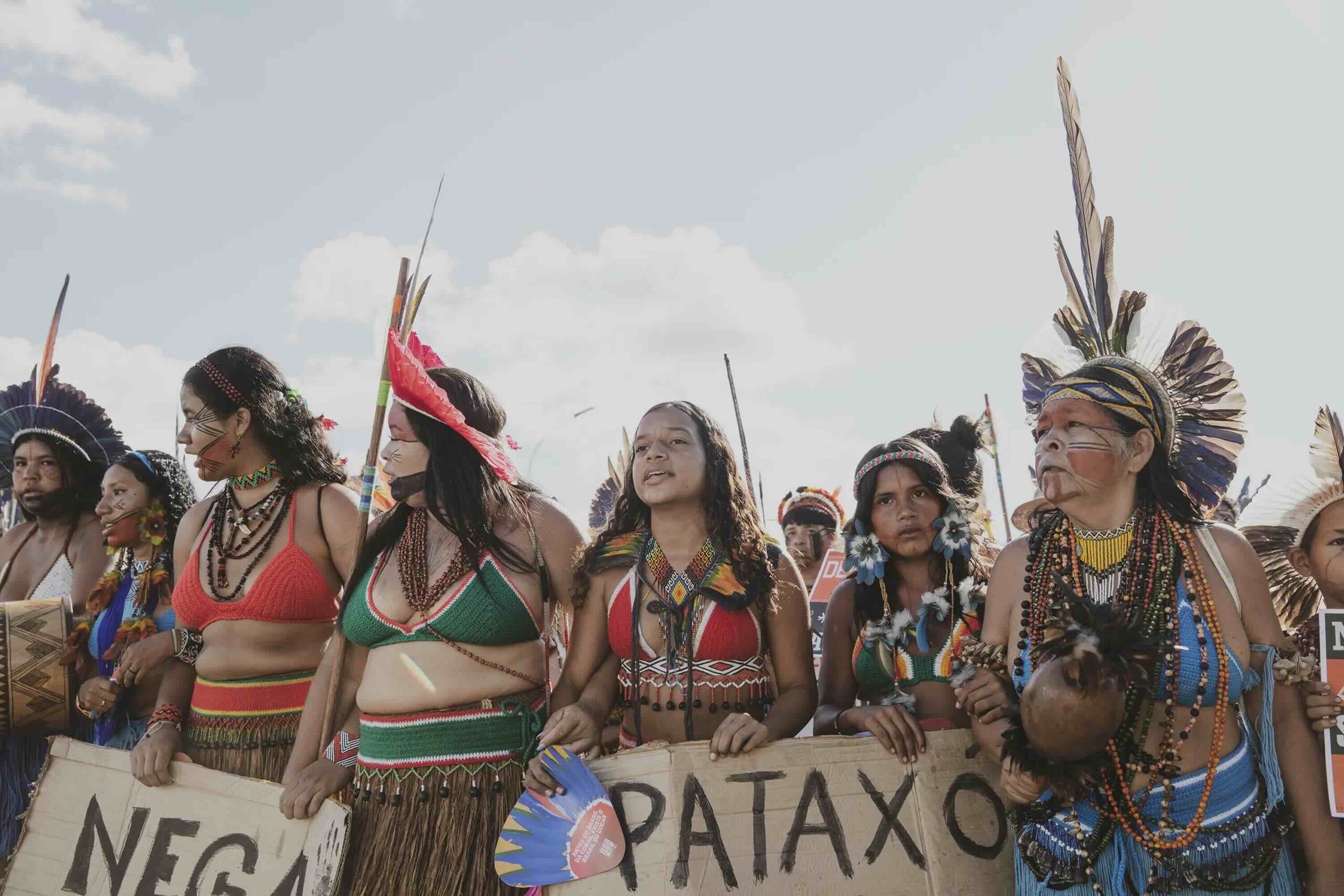 On April 25th, as they were painted, they prepared to march across the vast expanse that holds all the ministries and into the square of the three powers, where the Court holds the case against the ‘time limit trick’. While this legal framework had already been overruled by the Supreme Court, Congress included several of its articles in new legislations which have now been approved, and this is why the Association of Indigenous Peoples of Brazil, APIB, has filed a case, once again, in the Supreme Court against it and is waiting to know when and how it will rule. If the ‘time limit trick’ is not overruled in the Court, hundreds of thousands of hectares of standing forest would face the threat of land grabs, leading to further deforestation, and subsequently large-scale cattle farming and agribusiness moving in, Indigenous Peoples all over Brazil would be evicted and attacked in their traditional territories, and countless species would be lost in the sites currently protected by them.