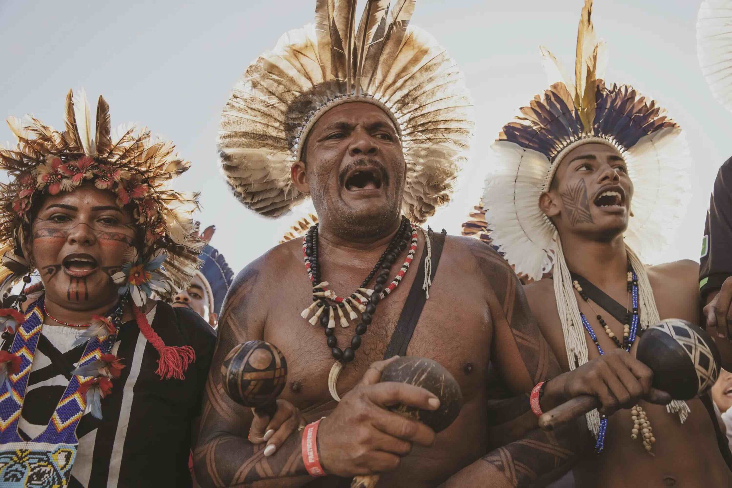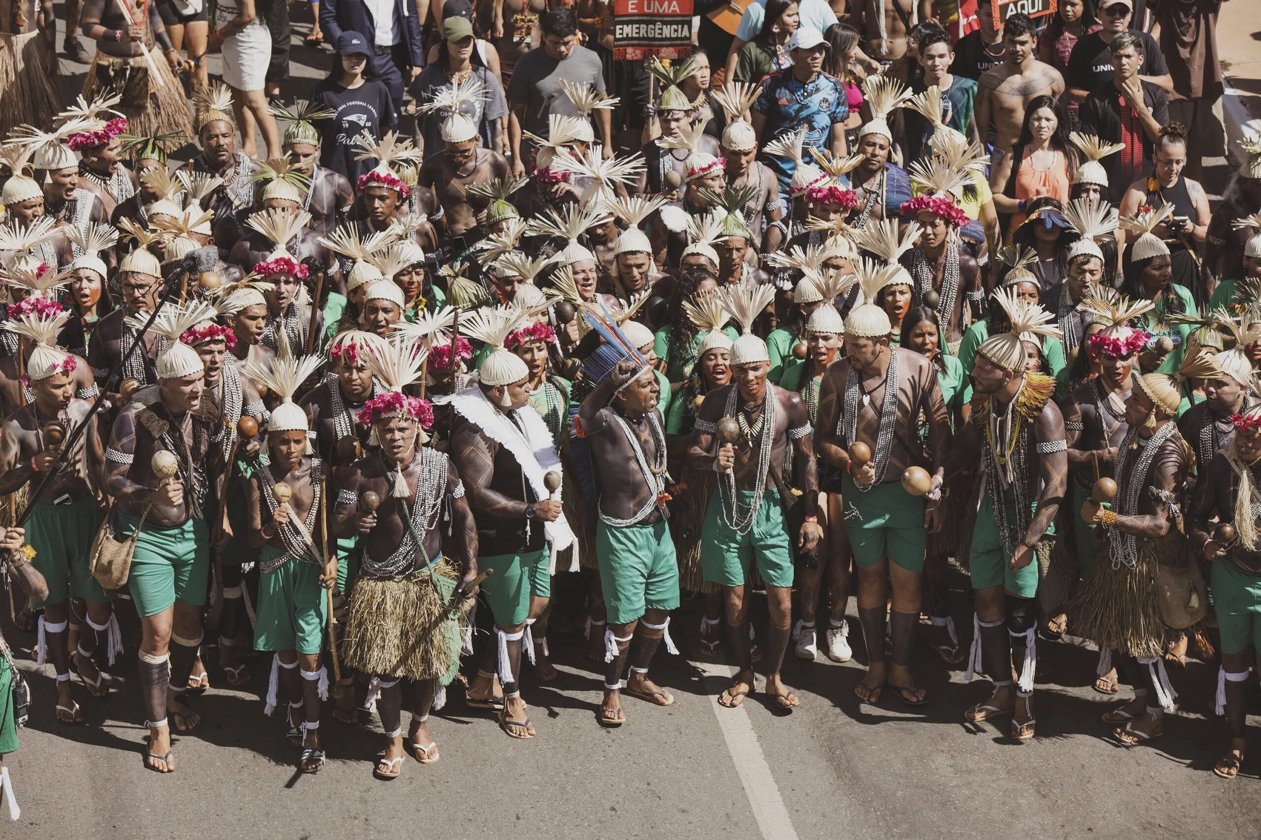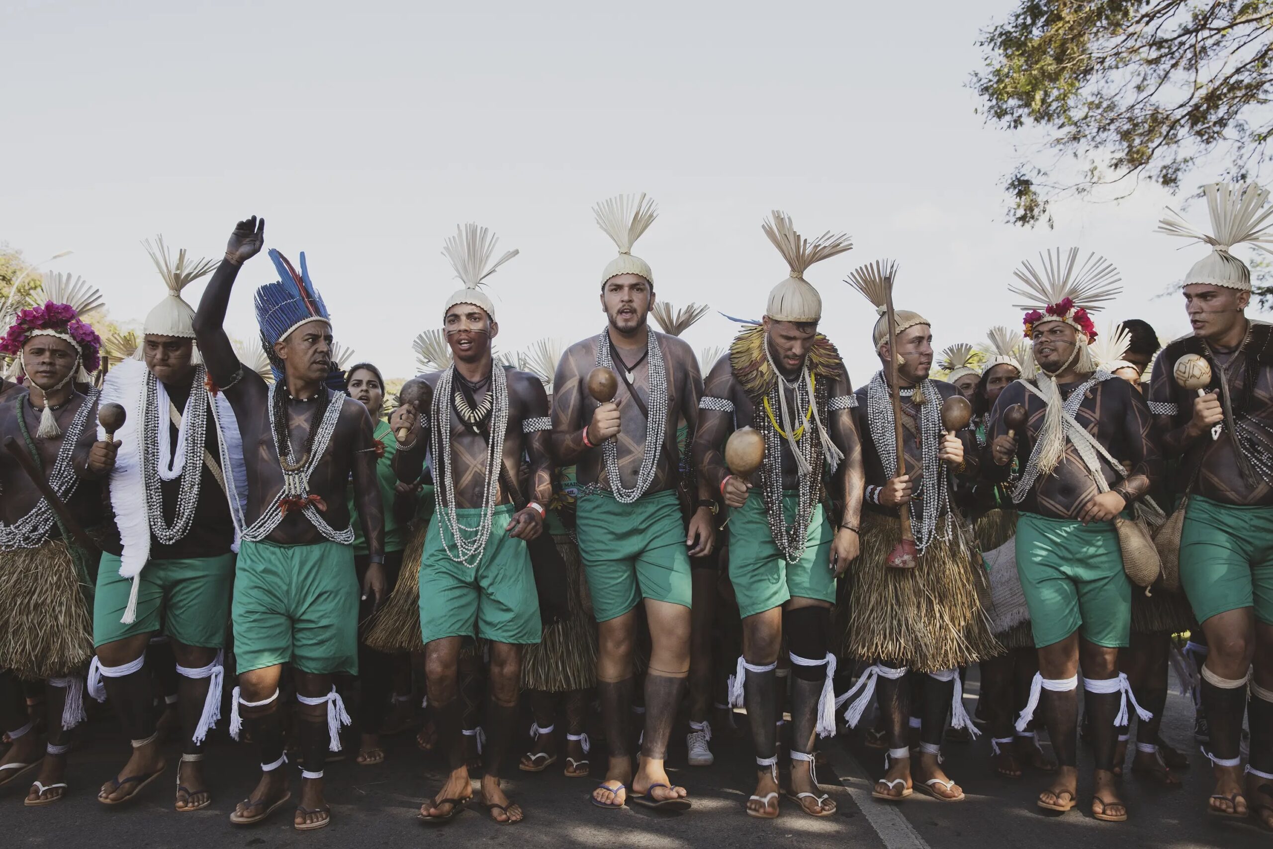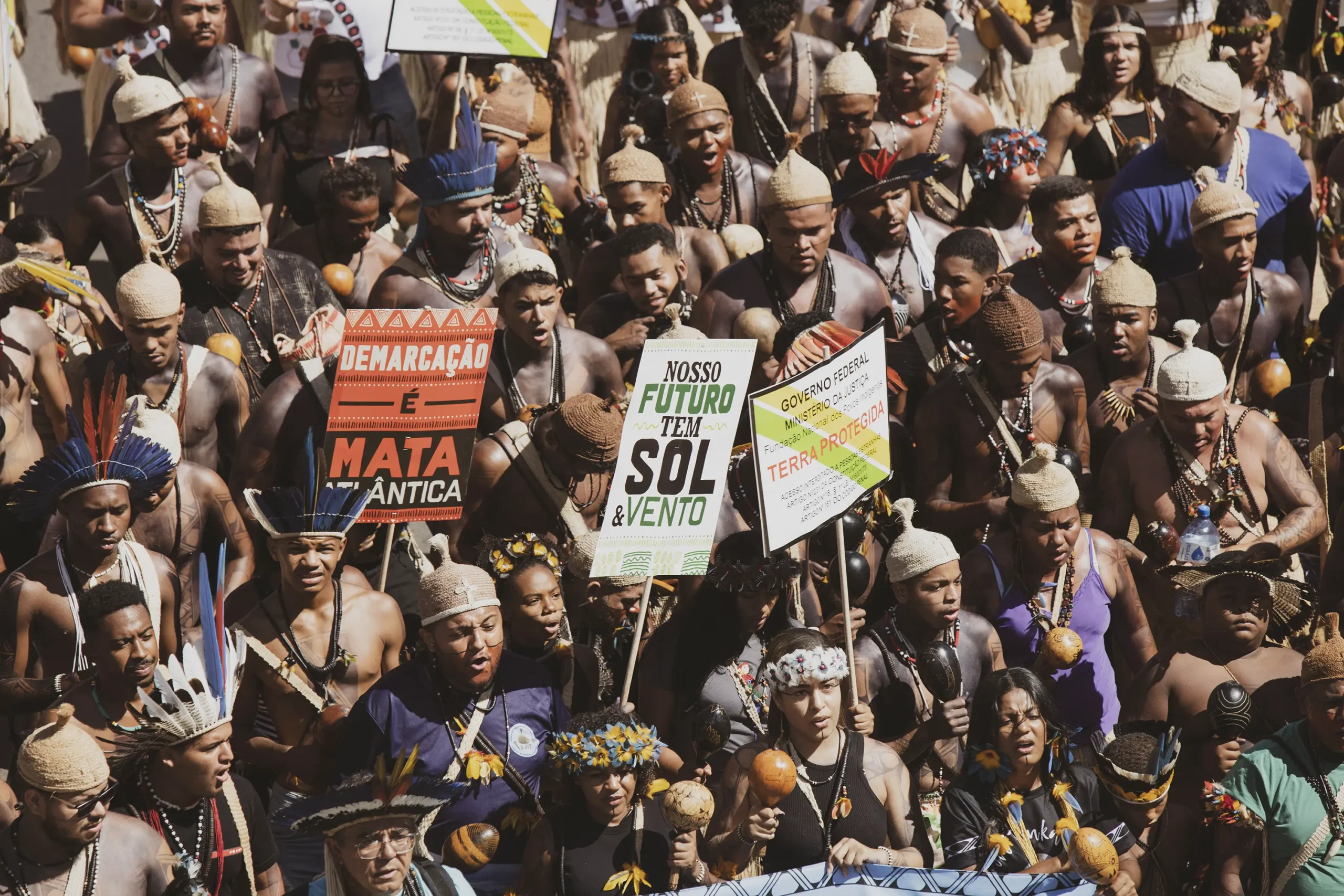On April 25th, as they were painted, they prepared to march across the vast expanse that holds all the ministries and into the square of the three powers, where the Court holds the case against the ‘time limit trick’. While this legal framework had already been overruled by the Supreme Court, Congress included several of its articles in new legislations which have now been approved, and this is why the Association of Indigenous Peoples of Brazil, APIB, has filed a case, once again, in the Supreme Court against it and is waiting to know when and how it will rule. If the ‘time limit trick’ is not overruled in the Court, hundreds of thousands of hectares of standing forest would face the threat of land grabs, leading to further deforestation, and subsequently large-scale cattle farming and agribusiness moving in, Indigenous Peoples all over Brazil would be evicted and attacked in their traditional territories, and countless species would be lost in the sites currently protected by them.