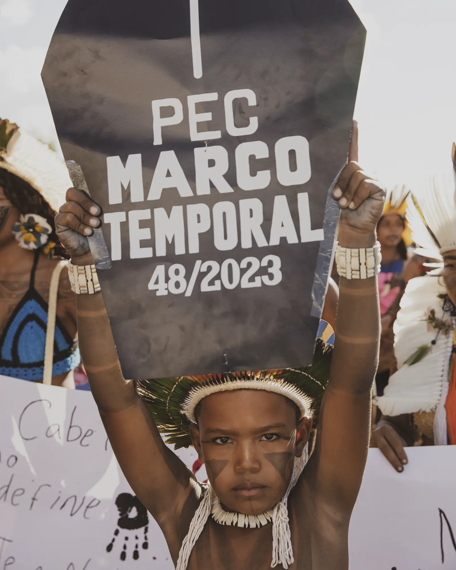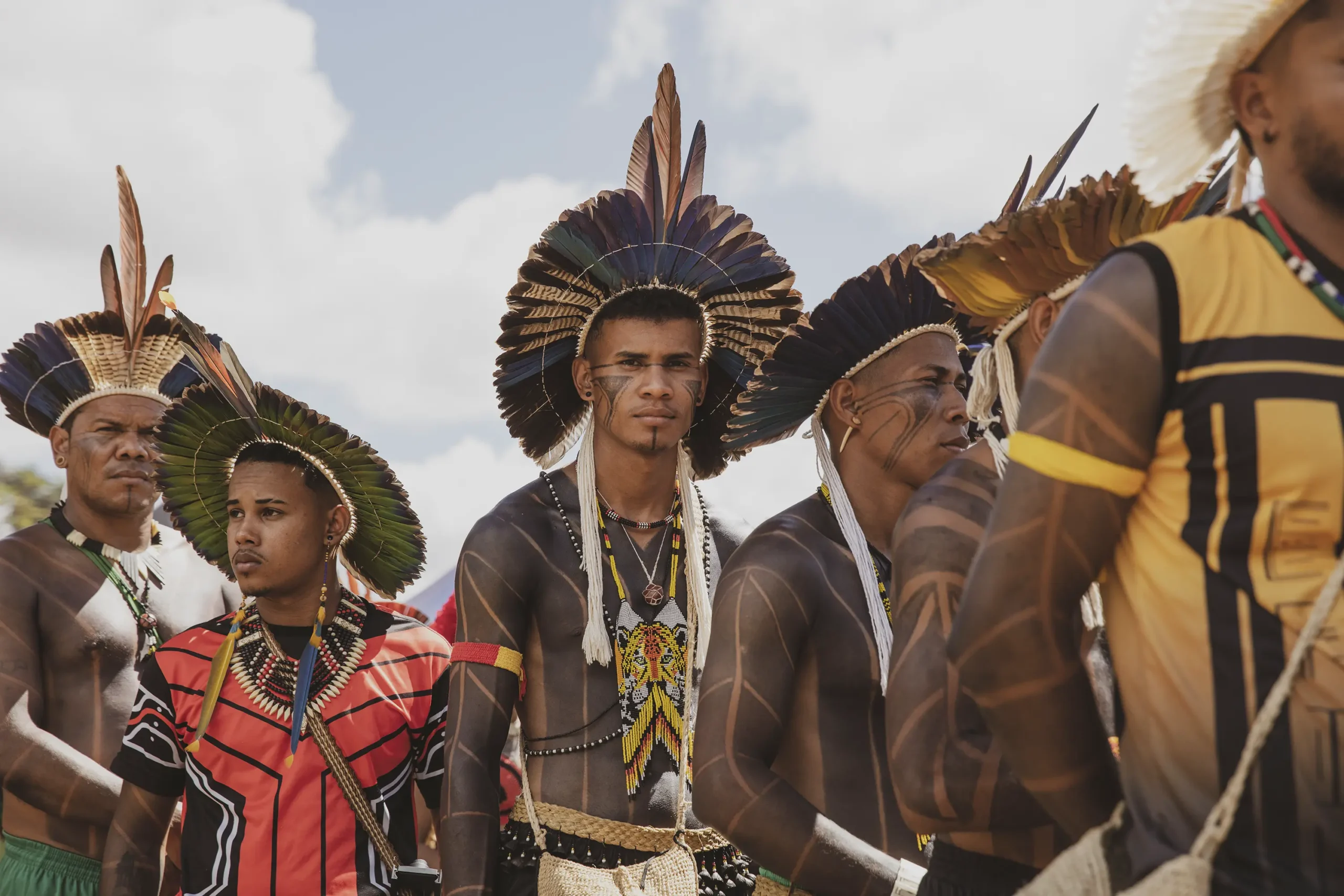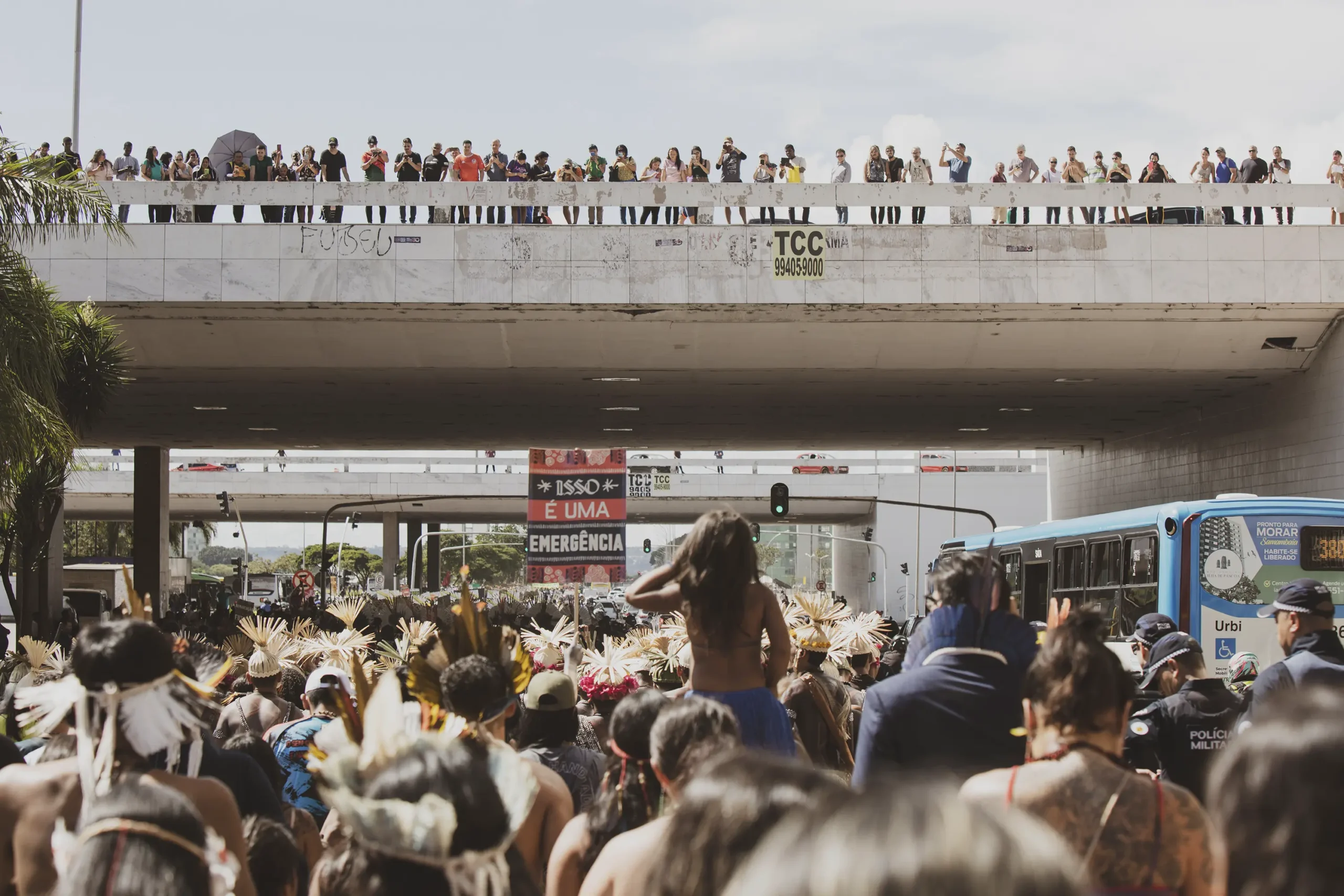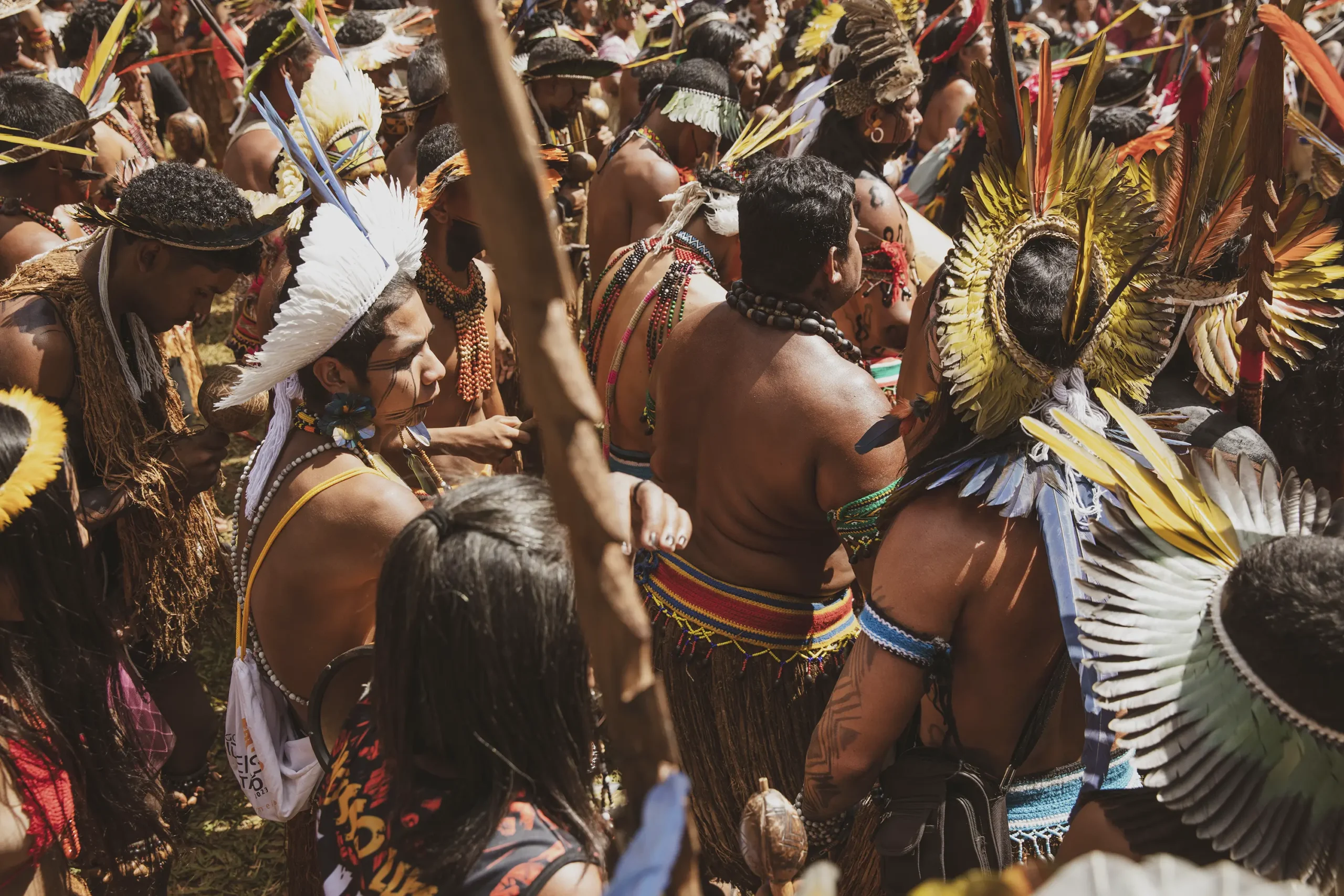 On April 25th, as they were painted, they prepared to march across the vast expanse that holds all the ministries and into the square of the three powers, where the Court holds the case against the ‘time limit trick’. While this legal framework had already been overruled by the Supreme Court, Congress included several of its articles in new legislations which have now been approved, and this is why the Association of Indigenous Peoples of Brazil, APIB, has filed a case, once again, in the Supreme Court against it and is waiting to know when and how it will rule. If the ‘time limit trick’ is not overruled in the Court, hundreds of thousands of hectares of standing forest would face the threat of land grabs, leading to further deforestation, and subsequently large-scale cattle farming and agribusiness moving in, Indigenous Peoples all over Brazil would be evicted and attacked in their traditional territories, and countless species would be lost in the sites currently protected by them.