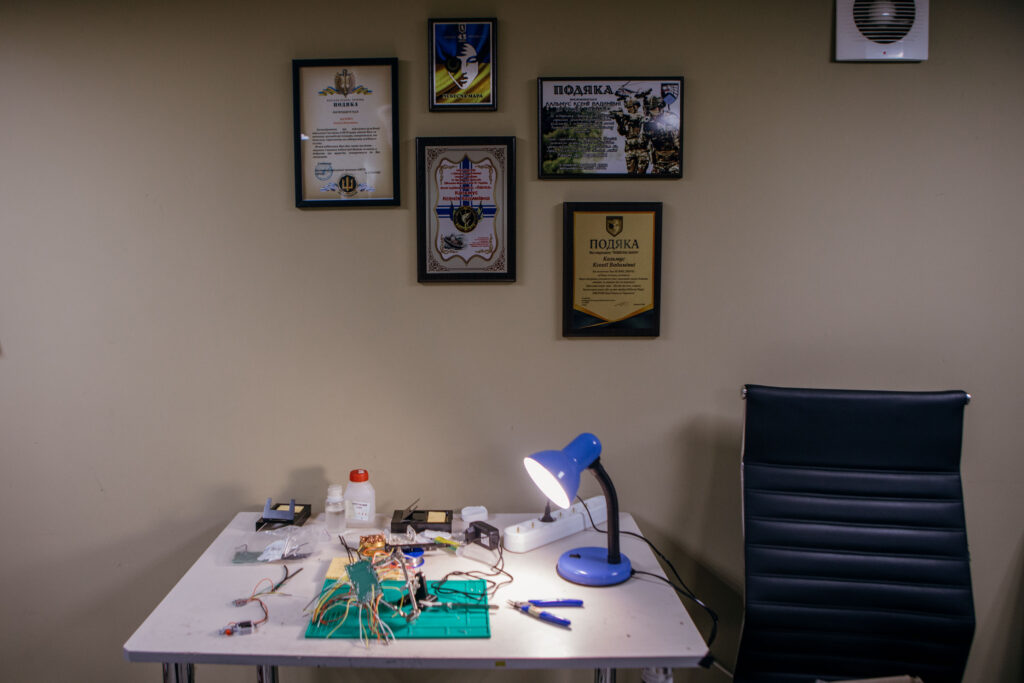 In the piloting course, she was the only female out of her 70 other comrades, whom she describes as tough guys who had liberated the eastern Kharkiv and Kherson regions. Upon completing the course, she has continued cultivating relationships with instructors there. They test and provide vital feedback on Klyn drones, which Kalmus and her team directly implement into their next batch. “The military really needs drones,” she says from the basement workshop. “I have close people in my life, including my brother, who need drones.”